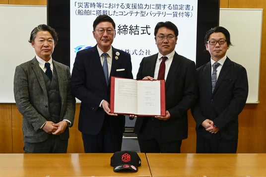 今治市は、2025年3月19日(水)に、和幸船舶株式会社(本社:兵庫県神戸市西区、代表取締役社長:安井和弥)、株式会社SIM-SHIP(本社:東京都港区、代表取締役社長:浦山秀大)、一般社団法人内航ミライ研究会(所在地:愛媛県今治市、代表理事:垰野治次)の3社と、「船舶に搭載したコンテナ型バッテリーの貸付等に関する災害協定(以下、本協定)」を締結いたしました。