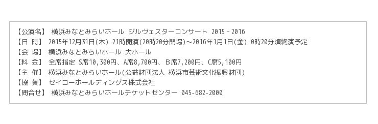 12月31日、大晦日の夜9時に開演。一流アーティストがこの日のためだけに集まり、2015年と2016年にちなんだ名曲の数々が披露されます。音楽を聴きながらカウントダウンし、演奏が終わると同時に新年を迎えるというスタイルはこのコンサートならでは。今年のチケットが発売開始となりました!