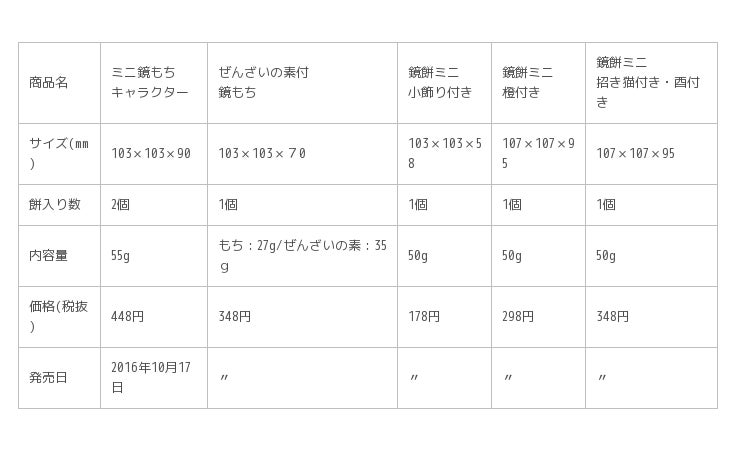 かわいいキャラクター鏡餅や狭い場所にも飾れるミニサイズ、ぜんざいとして食べられるセットなど、新たなアイテムを発売します。