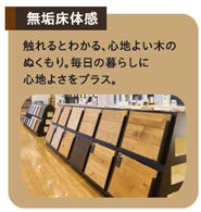 無垢床体感:樹種による色合い、木目、硬さの異なる無垢材の床に実際に触れ、その質感や温もりを確かめることができます。