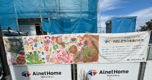 ↑地域の保育園と共同で園児による「ぼく・わたしの未来のまち」お絵描きを実施。子どもたちの絵で地域の建築現場を彩る取り組み