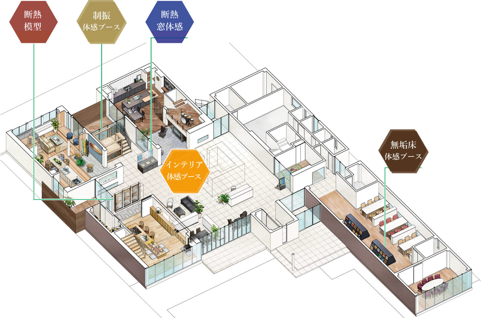 構造・断熱模型: 建ててからでは見えなくなる壁の内部構造や断熱材の仕様を、リアルな断面模型で展示。ダブル断熱の仕組みなどを視覚的に理解できます。