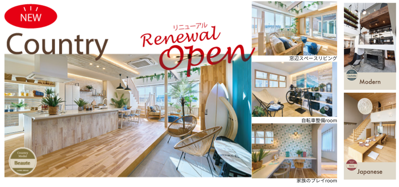 ライフスタイルに合わせて選べる「Country(カントリー)」「Modern(モダン)」「Japanease(ジャパニーズ)」という3つの異なるインテリアスタイルのモデルルームを併設。お客様の好みに最適な住まいの形を見つけることができます。特に今回のリニューアルではカントリーモデルを一新し、自然素材の温かみと最新のデザイントレンドを融合させた空間をご提案します。ご自身の好みに最適な住まいの形を見つけることができます。