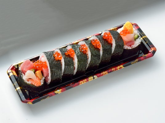 まぐろ、サーモン、白身、いくら、煮あなご、蒸しえび など海鮮をたっぷりと巻き込んだ、お祝いにぴったりの巻き寿司です。一切れで贅沢海鮮をしっかり堪能いただけます。
