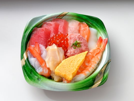 まぐろ、いくら、サーモン、白身、蒸しえび、玉子焼き、きゅうり、錦糸玉子