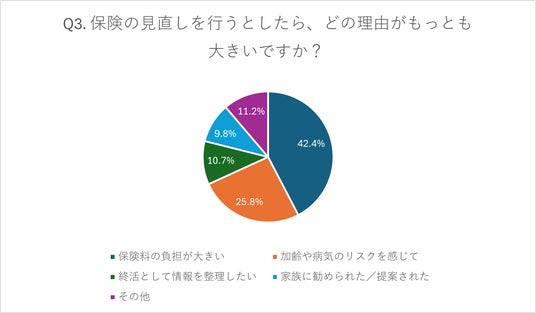 Q3では、「保険の見直しを行う理由」として最多だったのは「保険料の負担が大きい」(42.4%)でした。次いで「加齢や病気のリスクを感じて」(25.8%)、「終活として情報を整理したい」(10.7%)と続きました。