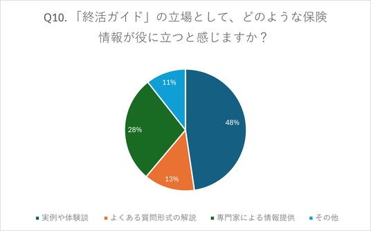 Q10では、「終活ガイドとして役に立つと感じる保険情報」について、「実例や体験談」が48%と最も多くの支持を集めました。次いで「専門家による情報提供」(28%)、「よくある質問形式の解説」(13%)と続き、実用性と信頼性を兼ね備えた情報が求められていることが明らかになりました。