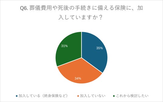Q6では、「葬儀費用や死後の手続きに備える保険に加入している」が35%、「これから検討したい」が31%となり、合わせて66%を超える人が「終活を意識した保険」に関心を持っていることが明らかになりました。