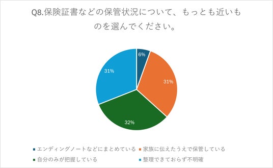 Q8の設問では、「保険証書などの保管状況」について、「自分のみが把握している」(32%)が最多となりました。次いで「家族に伝えたうえで保管している」(31%)、「整理できておらず不明確」(31%)と、全体の6割以上が“家族と適切に情報を共有していない”可能性があることが分かります。