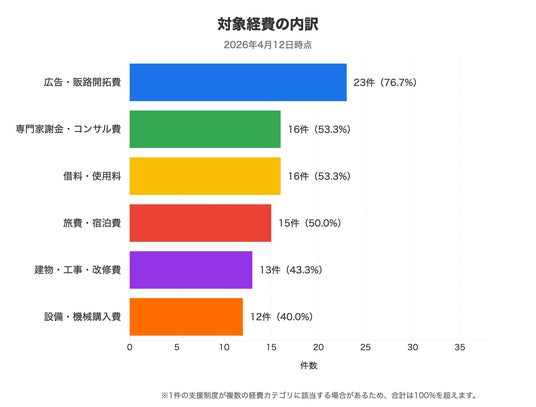 (1)展示会の出展費・商品パンフレット制作費など「広告・販路開拓費」を対象にした制度が30件中約8割を占めます。さらにその半数超が専門家謝金・コンサル費も対象にしており、出展準備の相談費から出展費用まで1つの制度で申請できる構成です。