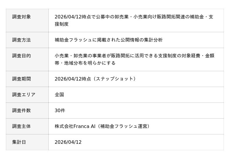 株式会社Franca AI(本社:東京都中央区)が運営する、全国の補助金・助成金を検索できるサービス『補助金フラッシュ』(https://hojokin-kensaku.jp/)は、2026/04/12時点で公募中の卸売業・小売業向け販路開拓関連の補助金・支援制度30件を集計分析しました。