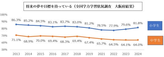 データから分かるように、こどもたちの「いのち」を危険にさらす虐待は減らず、また学校へ行かない(行けない)こどもたちは年々増加の一途をたどっています。さらに、小学校6年生と中学校3年生にアンケートを取ったところ、将来の夢や目標を持っているという中学生は年々下がる一方です。教育はこどもの未来を創出できるものでなければいけないはずです。また、こどもたちの自死も過去最高を記録したと報道されています。