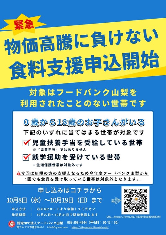 フードバンク山梨では、こうした現状を受けて10月28日(火)~31日(金)に「緊急食料支援」を実施します。