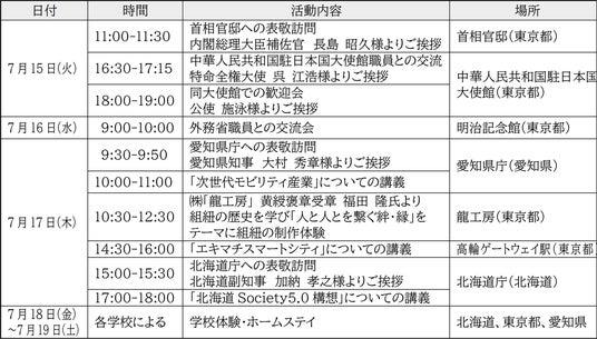 本プログラムでは、7月14日(月)~7月19日(土)の間、中国の高校生40名を日本へ招聘し、日本の高校生と交流活動を行います。プログラム前半では、首相官邸や中華人民共和国駐日本国大使館への表敬訪問を行います。また、プログラム後半では北海道、東京都、愛知県のエリアに分かれ、道庁や県庁への表敬訪問活動、その地域ならではの「ものづくり」や「まちづくり」をコンセプトとした歴史・文化活動、日本の学校体験等を行います。