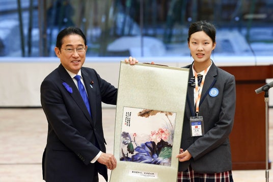 中国の高校生代表者による岸田首相(当時)への記念品贈呈