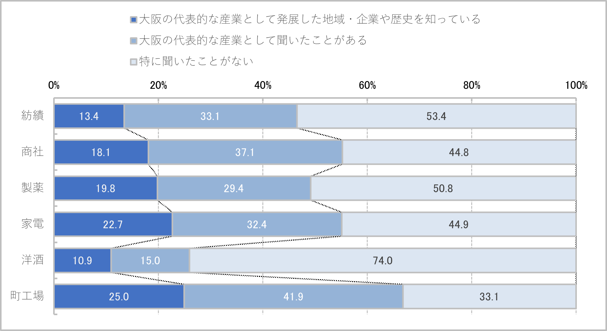 3.大阪の代表的な産業(紡績、商社、製薬、家電、洋酒、町工場)に対する認知の割合