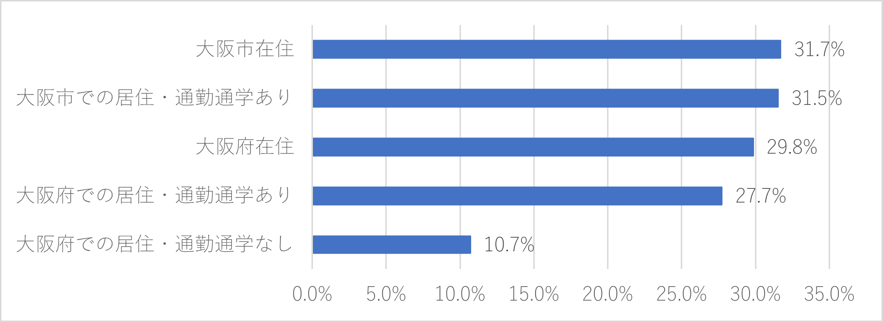 一方、居住地や通勤・通学している場所で違いをみてみると、大阪市在住の正答率が最も高く31.7%、大阪府の居住や通勤・通学の経験がない場合は10.7%と最も低くなりました。大阪府・大阪市とのかかわりの有無が正答率に影響を与えていることがわかる結果となりました。