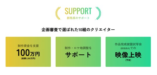 このコンペでは、制作資金の支援や、事務局による撮影のサポート・制作アドバイスなどを通じて、映像作品の制作というクリエイターの夢の実現を群馬県が応援します。