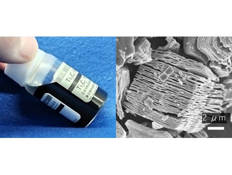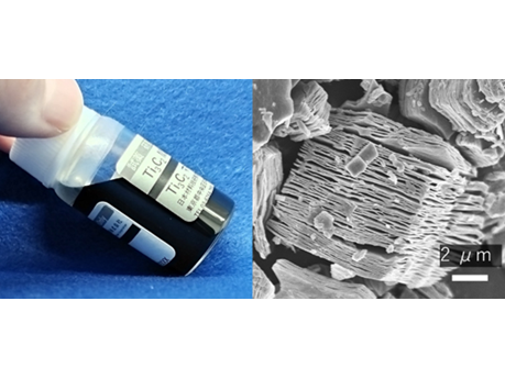 <MXene分散液とMXene粒子のSEM像>