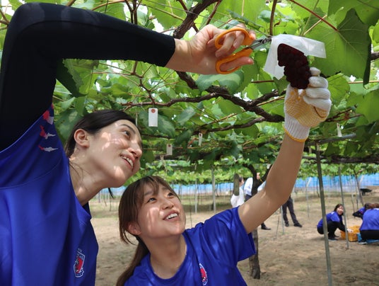 「PFUブルーキャッツ石川かほく」は、2025年7月1日(火)に、「石川かほく農業協同組合(JA石川かほく)」・「高松ぶどう生産組合」の協力をいただき、高松ぶどう生産組合 大田組合長のぶどう畑の摘房※にブルーキャッツの選手が参加いたしました。※摘房=収穫前に生育が遅れている房を切り落とすことにより、養分を集中させ、1房あたりのぶどうが持つ凝縮感(甘味・うまみ・厚み)のより強いぶどうをつくるための作業。