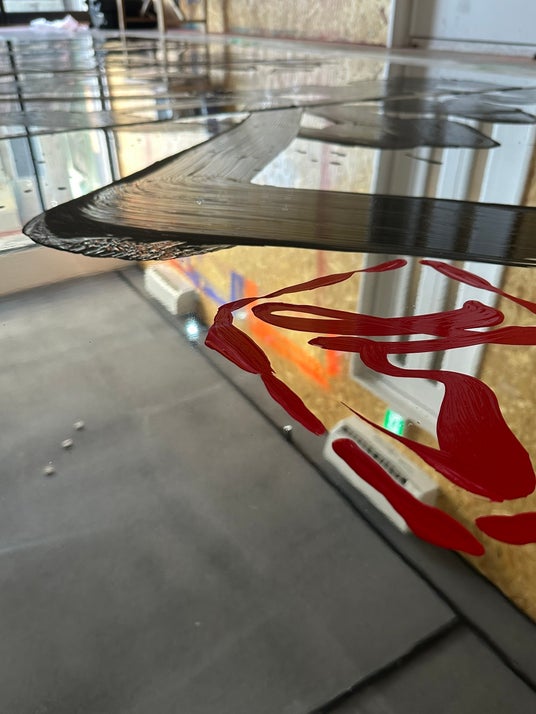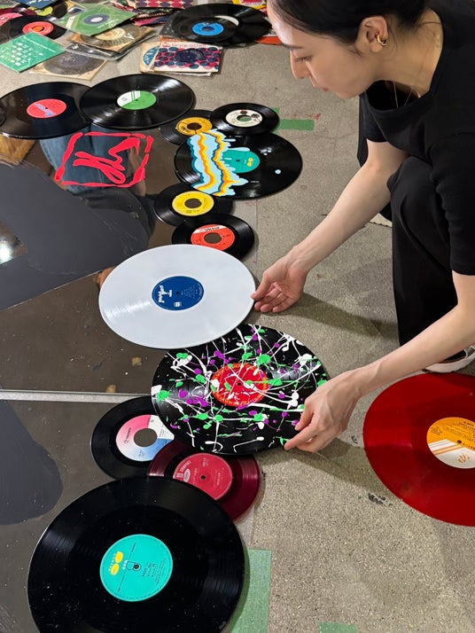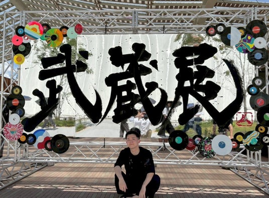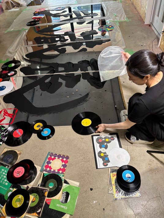 実際の制作は後日、摂津にある石富プロパティーのスタジオで、大きな鏡に墨でタイトルを書いていただいた。「鏡に書くことで、来場者や万博の景色をすべて写すこの作品に“インクルーシブ”を表現しました。そして初対面の時に感じた MUSASHIくんの、内側に秘めるエネルギーが爆発しそうな感じをイメージして、武・蔵・展の3つの文字の跳ね上げる部分を右にいくほど大きくなるように描きました」。さらに、この力強い書の周囲に散りばめられたのは、音楽が好きだというMUSASHIのイメージに合わせて彩色したレコード盤を貼り付けたもので、これがMUSASHI作品にも通じるPOPさや可愛さを添えていた。