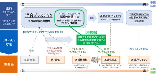 世界規模で資源循環社会およびカーボンニュートラルの実現に向けた動きが活発化する中、従来の化石資源を原料とし、製造工程および廃棄時の燃焼処理で多くのCO2を排出するプラスチックを再資源化し、プラスチック原料となる基礎化学品へと戻すケミカルリサイクル*2が求められています。高度に選別された、もしくは単一のプラスチックを、基礎化学品の原料となる混合油(ナフサ相当油等)に変換する油化技術、あるいはエチレン、プロピレンなどの基礎化学品に直接変換するケミカルリサイクル技術はありますが、そのような選別/単一プラスチックの発生量は限定的です。また、プラスチックの選別・分離にはコストがかかり、分離困難なプラスチックも多く存在します。そのため、混合状態で排出される使用済みプラスチックを、高度選別を経ずに熱分解し、直接基礎化学品へ変換・再生するケミカルリサイクル技術を確立できれば、より一層のGHG(温室効果ガス)削減に貢献できると期待されます。
