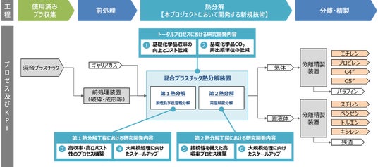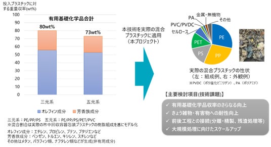 両社はこれまでに、新品のプラスチックを用いたモデル系での実験において、分解反応条件やプロセスの最適化に取り組み、ポリエチレン(PE)・ポリプロピレン(PP)・ポリスチレン(PS)の三元系では80wt%、より実際の混合プラスチックに近い、ポリエチレンテレフタラート(PET)・ポリ塩化ビニル(PVC)を加えた五元系では70wt%もの有用基礎化学品収率を実現しています。本プロジェクトにおいて、まずラボ(実験室)、ベンチ(少量試作)スケールで分解プロセスや反応器形式の選定を行い、パイロット(中量試作)スケール、大規模実証スケールとスケールアップを行いながら条件の最適化を進めます。また、商業化した際に生じうる課題の抽出・対策も並行して実施します。