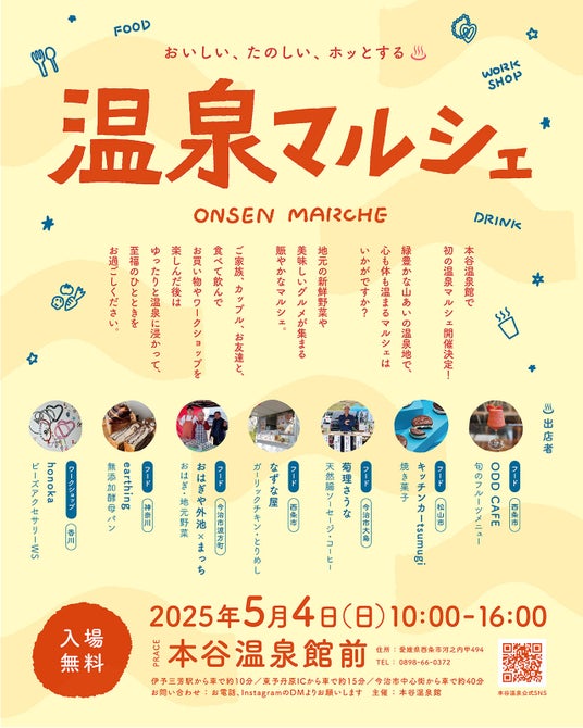 本谷温泉館(愛媛県西条市河之内甲494)は、「温泉マルシェ」を2025年5月4日(日・みどりの日)に開催します。同施設では初の試みで、県内外のフードやパン、スイーツ、ドリンクなどを来場者へ販売。地元野菜の販売やアクセサリー制作のワークショップなども行ないます。どうぞ当館で、素敵なゴールデンウイークをお過ごしください。