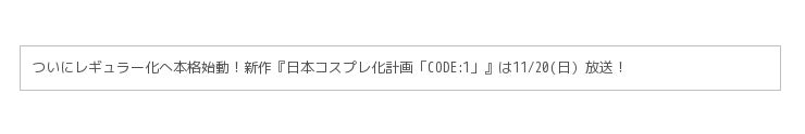 1億総コスプレイヤー時代を密かに企むファミリー劇場が発案した極秘プロジェクト。日本を代表する人気コスプレイヤーが集結し、コスプレの魅力を伝播させる。