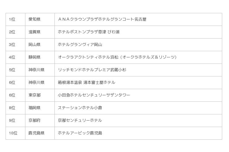 3位には岡山県の西日本旅客鉄道(JR西日本)の岡山駅直結のホテル「ホテルグランヴィア岡山」がランクインしました。宿泊者はデラックスツインルームの窓から新幹線を眺めることができます。利用者からは「窓からは新幹線が見え、鉄道好きの方なら最高」との声があがりました。
