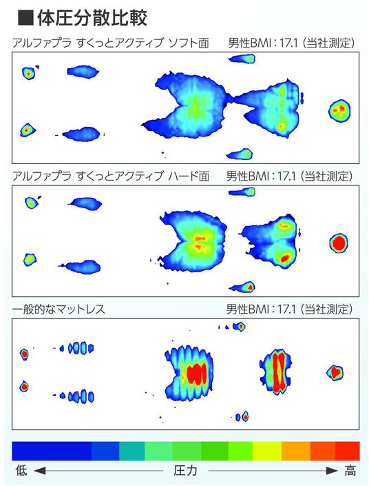ソフト面は沈み込み量を適切にコントロールすることで、高い体圧分散性能を有しています。ハード面は多くの理学療法士・作業療法士の意見を参考に仰臥位から端座位、端座位から立位などの一連の姿勢変換に伴う重心移動が滑らかにできるように設計しました。