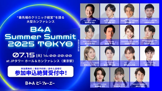 「B4A Summer Summit」は、大手クリニックの院長や各施術カテゴリーのトップランカーなど多数の著名ドクターとともに“最先端のクリニック経営”について語り合う、大型カンファレンスです。自由診療向け電子カルテ 導入院数No.1[※] の実績を誇るB4Aが、業界特化型ならではの深い知見と各所との強力なパートナーシップを大いに活用して実施します。