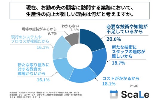 勤め先の顧客に訪問する業務において、生産性の向上は必要だと感じる、と回答された方を対象に「勤め先の顧客に訪問する業務において、生産性の向上が難しい理由は何だと考えるか」を尋ねる設問への回答では、1位が「必要な技術や知識が不足しているから」で20.0%、2位が「新たな技術にスタッフの適応が難しいから」で18.7%、3位が「コストがかかるから」で18.1%という結果になりました。この結果から、フィールドサービス・メンテナンス業界の現場の業務に3年以上従事し、勤め先の顧客に訪問する業務において、生産性の向上は必要だと感じる方の最も多くが、当該業務において生産性の向上が難しい理由は「必要な技術や知識が不足しているから」であると考えていることが判明しました。