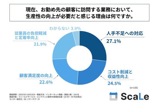 勤め先の顧客に訪問する業務において、生産性の向上は必要だと感じる、と回答された方を対象として「勤め先の顧客に訪問する業務において、生産性の向上が必要だと感じる理由」を尋ねる設問への回答では、1位が「人手不足への対応」で27.1%、2位が「コスト削減と収益性向上」で24.5%、3位が「顧客満足度の向上」で22.6%という結果になりました。この結果から、勤め先の顧客に訪問する業務において、生産性の向上が必要だと考えられている理由のトップは「人手不足への対応」であることがわかりました。