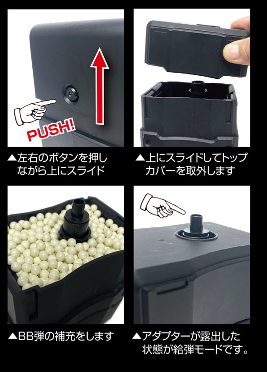 手間のかかるBB弾補充にサヨナラ。誰でもカンタン、押すだけで自動給弾!