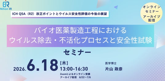 アイアール技術者教育研究所は、バイオ医薬製造工程におけるウイルス除去・不活化プロセスと安全性試験をテーマに、ICH Q5A(R2)改正ポイントとウイルス安全性評価の実務動向を解説するオンライン公開セミナーを開催します。