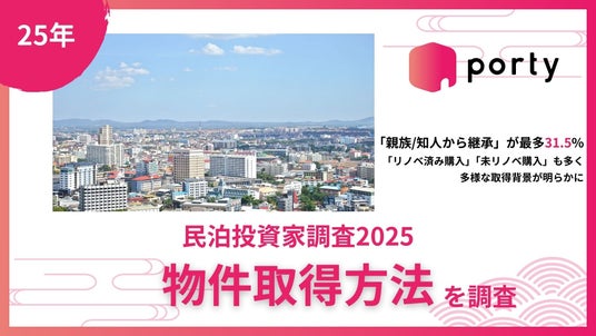 空き家マッチングアプリ「porty(ポルティ)」を運営する株式会社ポルティ(本社:神奈川県川崎市、代表取締役:平 瑶平)は、民泊投資家(1件以上の運営経験者)200名を対象に、これまで民泊物件を取得した主な方法について調査しました。
