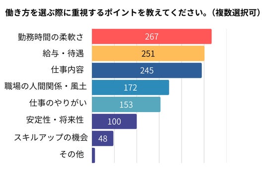 働き方を選ぶ際に重視するポイント、トップ3は「勤務時間の柔軟さ」「給与・待遇」「仕事内容」