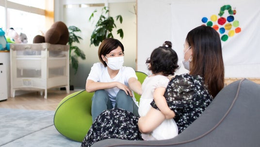 産後ケア施設の様子。利用者が助産師に子どもの育児相談をしています。