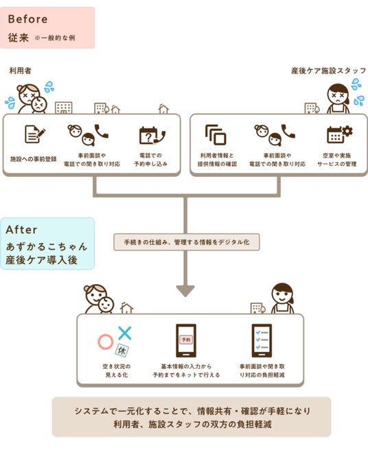 あずかるこちゃん産後ケア導入によって利用者、産後ケア施設スタッフ双方の負担軽減が期待できます。