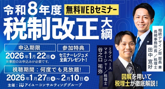 税理士法人を母体に国内外15拠点で中小企業・資産家向けにサービスを展開するアイユーコンサルティンググループ(本社:東京都豊島区/代表:岩永 悠、共同代表:出川 裕基)は、は2026年1月27日(火)より「令和8年度税制改正大綱解説セミナー」をオンデマンド配信いたします。