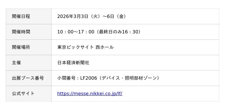 エレクトロニクス商社の丸文株式会社(代表取締役社長 兼 CEO / COO︓堀越裕史、本社︓東京都中央区、以下、丸文)は、3月3日(火)~6日(金)に東京ビックサイトで開催される「ライティング・フェア 2026 」に出展します。