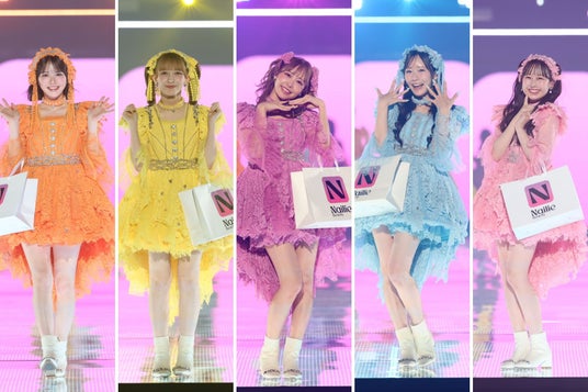 続いて、鎮西寿々歌さん、早瀬ノエルさん、仲川瑠夏さん、真中まなさん、松本かれんさんが順番に登場。華やかにランウェイを歩きながら、ネイリービューティーのQRコードがプリントされたカラーメンバーボールを客席に投げ込み、観客のボルテージは一気に上昇しました。