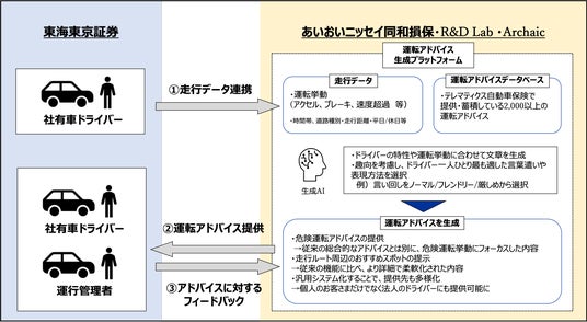 株式会社Archaic(代表取締役社長:横山 淳)は、MS&ADインシュアランスグループのあいおいニッセイ同和損害保険株式会社(以下「あいおいニッセイ同和損保」)および同社グループ会社のAioi R&D Lab - Oxford(以下「R&D Lab」)とともに、車両の走行データを基に生成AIが安全運転に向けたアドバイスをドライバーごとに作成する「運転アドバイスプラットフォーム」(以下「本システム」)を開発し、2025年11月から東海東京証券株式会社(以下「東海東京証券」)と共同で実証実験を開始します。