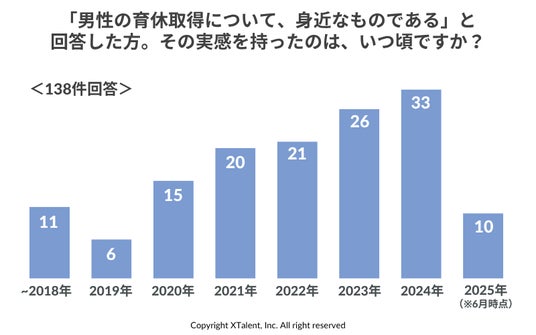 「男性の取得について身近なものである」と実感を持った時期としては、2019年以降、上昇傾向にあり、年々男性の育休取得が身近なものになっていることが伺えた。