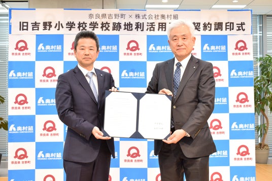 株式会社奥村組(本社:大阪市阿倍野区、代表取締役社長:奥村 太加典、以下「奥村組」)と奈良県吉野町(町長:中井 章太、以下「吉野町」)は、2025年11月20日に「旧吉野小学校学校跡地利活用事業(以下、「本事業」)に係る事業用定期借地権契約および建物使用貸借契約(以下、「本契約」)」締結の調印式を奥村組クロスイノベーションセンターで執り行いました。