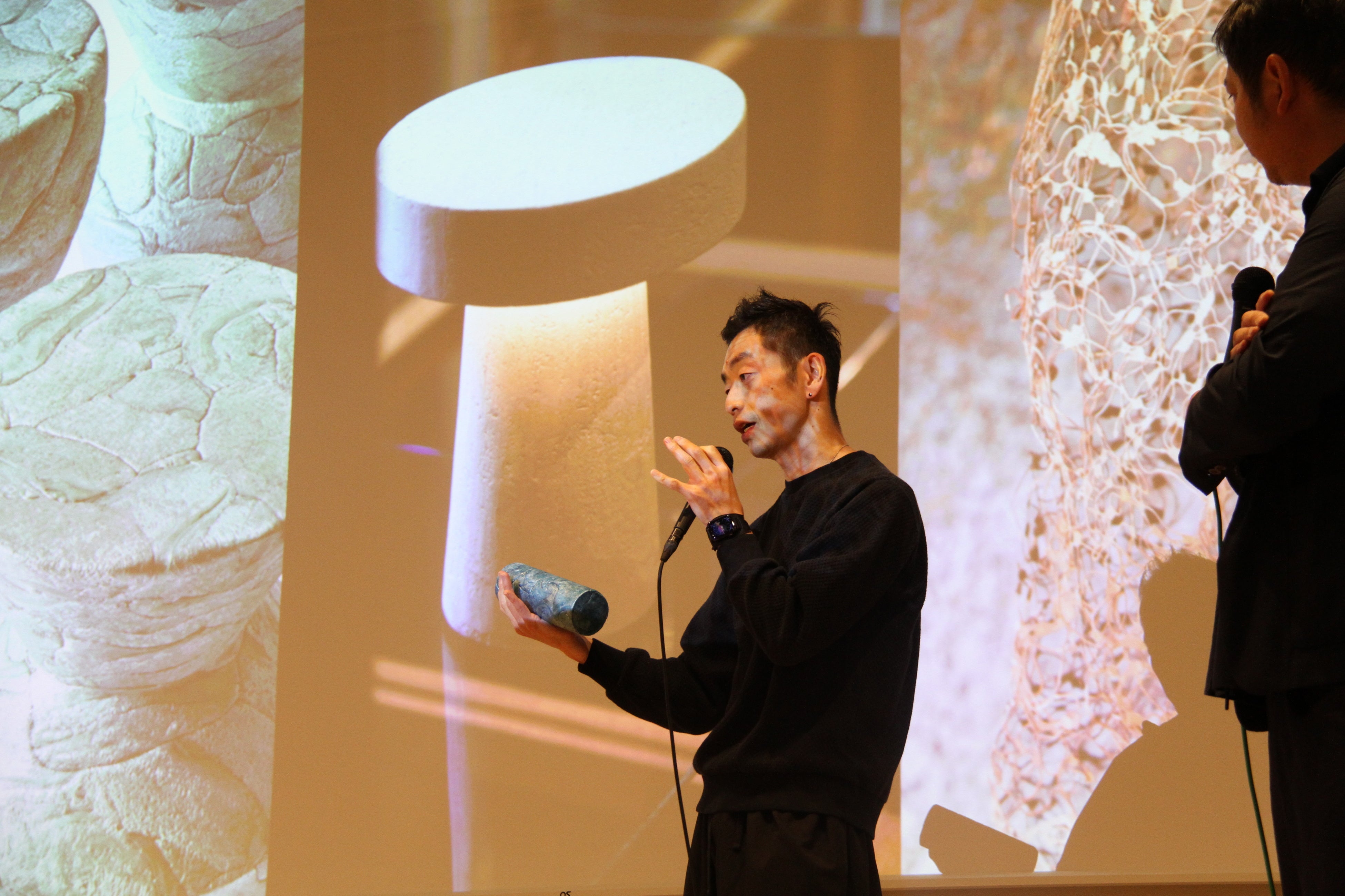 we+の林氏は、行動変容の“最初のアプローチ”として、視覚的にゼロの価値しか見出されていない「廃棄物」をデザイン・アートピースへと変えることで、人の心に“興味”や“驚き”を生み出す取り組みの思想や概念を語った。