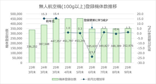 2025年は、無人航空機(100g以上)の登録制度開始(2022年)から初めて3年間の有効期間満了を迎えた年でした。登録機体の推移は以下図に示す通りです。未更新の登録機体削除に伴う一時的な登録数の減少が観測されたものの、新規登録機体数はその後も大きく落ち込むことなく推移し、9月末時点の登録数は約35万機(*1)となり、機体登録制度自体は成熟・安定化に向かっていると捉えています。