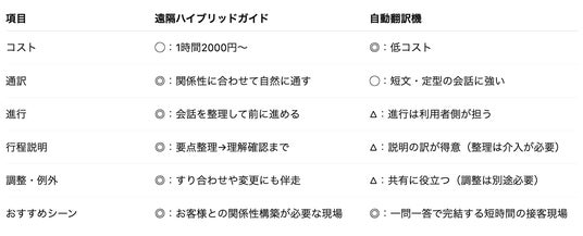 自動翻訳機(翻訳アプリ)はより低コストで導入が可能な一方、訪日観光現場では「段取り」「文脈・関係性構築」「合意形成」まで含めたホスピタリティが求められます。当社は通訳だけではなく、現場の進行をを滞りなく行う「サービス」に重点を置きます。
