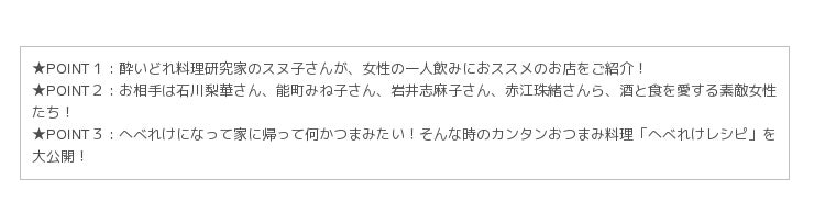 酔いどれ料理研究家として、お酒好き&料理好き女子の間で人気の高まっている“スヌ子”こと稲葉ゆきえさん。そんな彼女が、酒と食を愛するゲストと共にスヌ子おすすめの“女ひとり飲み店”へと繰り出す!番組の最後には、酔いどれていても作れるカンタンおつまみのミニお料理コーナーも!